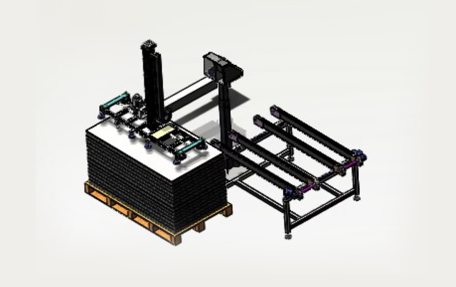 自動排版機的主要功能單元有:玻璃輸送定位系統(tǒng)、抓取行走系統(tǒng)、視覺檢測系統(tǒng)、電控系統(tǒng)等;通過以上功能單元,實現(xiàn)了將自動串焊機串焊好的電池串,按照工藝尺寸要求和排版方向順序自動排版鋪設(shè)到玻璃(EVA已經(jīng)鋪設(shè))上,組成電池串陣列。玻璃/EVA通過傳輸線傳輸至指定位置,機械手抓取電池串實現(xiàn)CCD定位、自動旋轉(zhuǎn)、自動排版功能。設(shè)備通過同步帶傳輸與自動生產(chǎn)線對接,實現(xiàn)了自動流水作業(yè)。